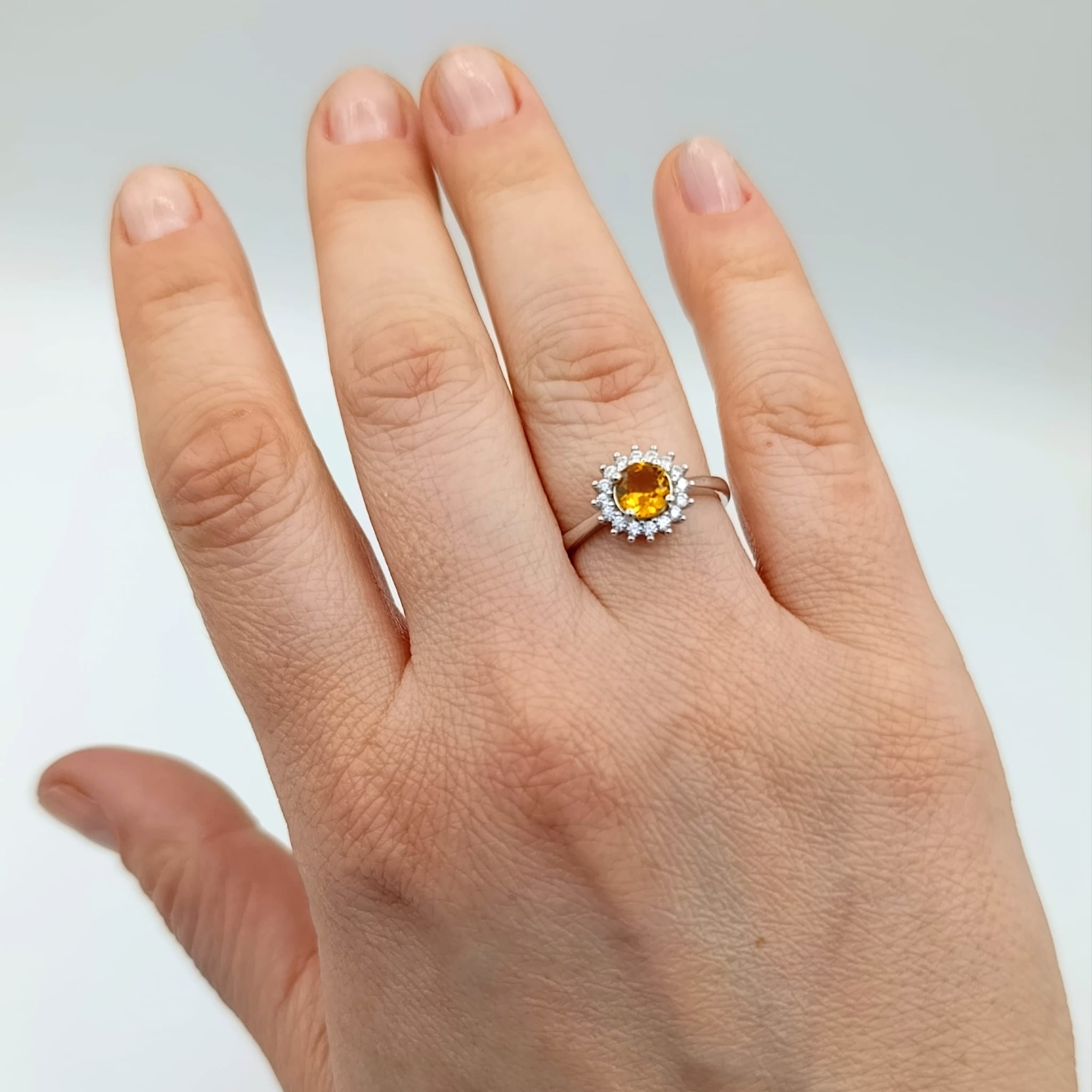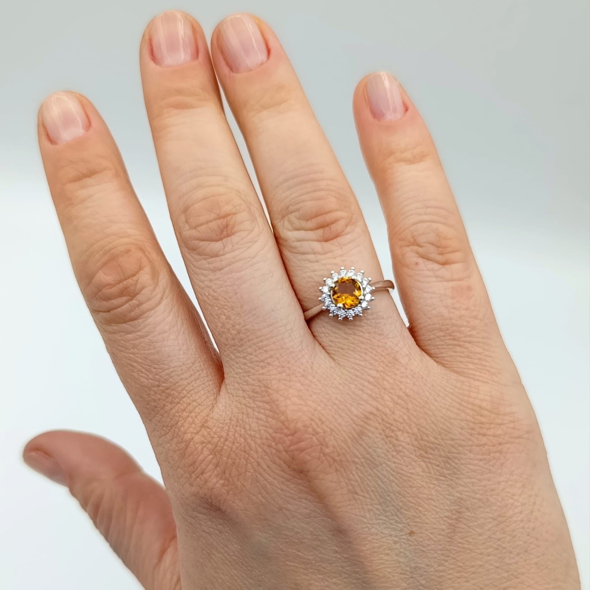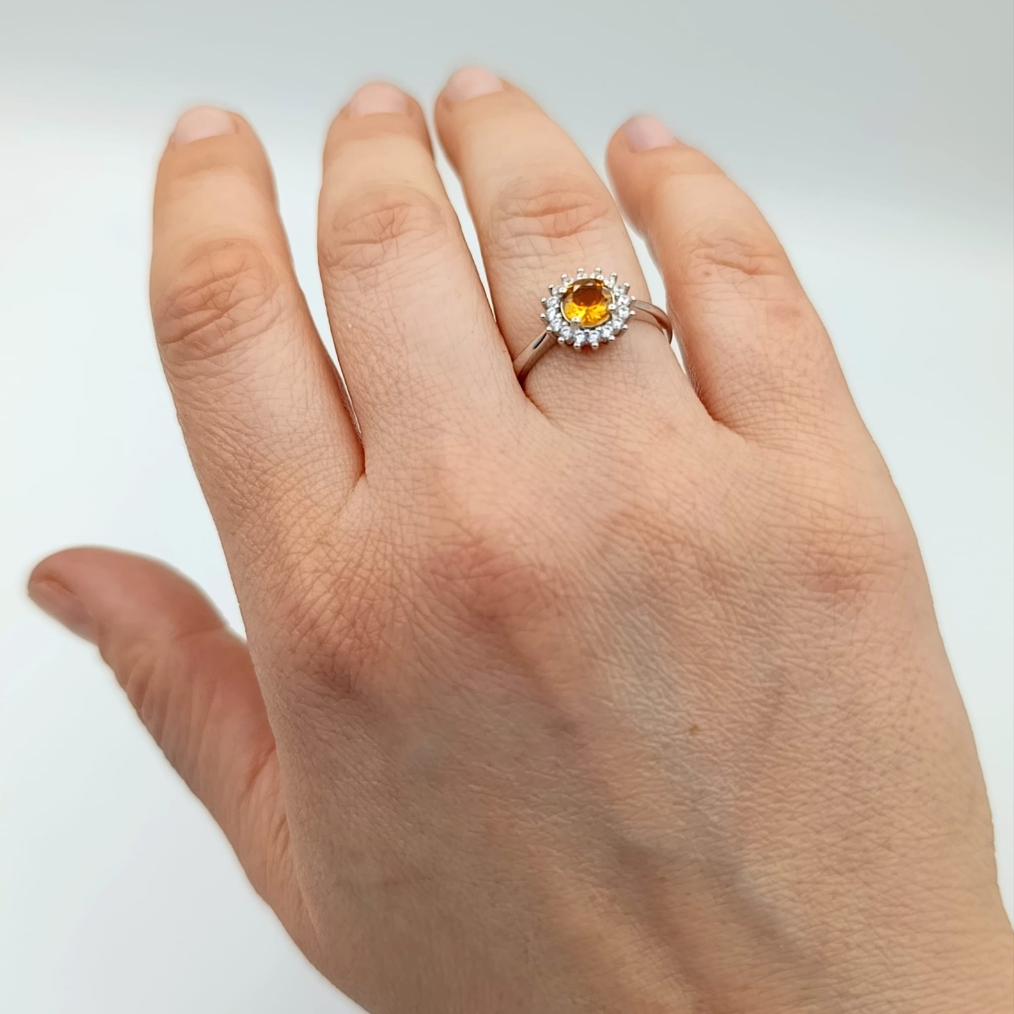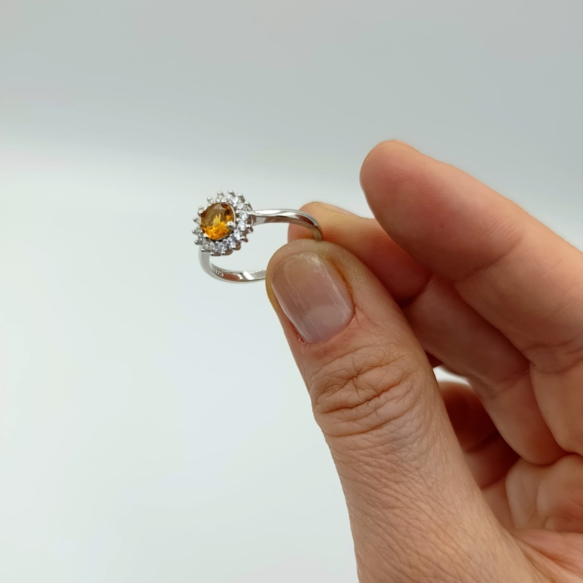 Zjawiskowy pierścionek z naturalnym cytrynem to idealne połączenie klasyki i ciepłego blasku. Jasnozłoty kamień otoczony iskrzącymi cyrkoniami pięknie komponuje się z chłodnym odcieniem rodowanego srebra. Biżuteria emanuje elegancją, ale i radością – idealna dla kobiet, które lubią błyszczeć, zachowując przy tym subtelność i styl.