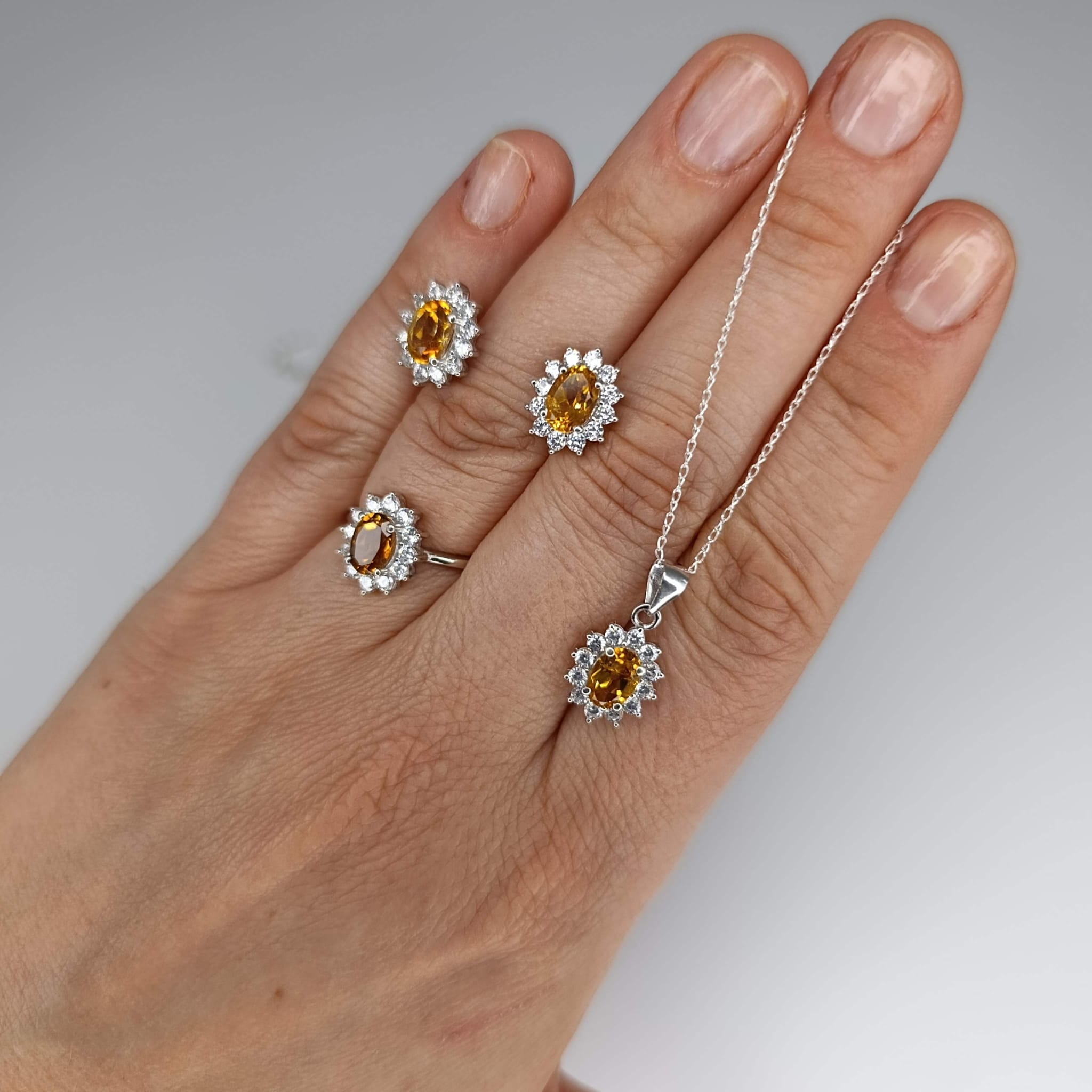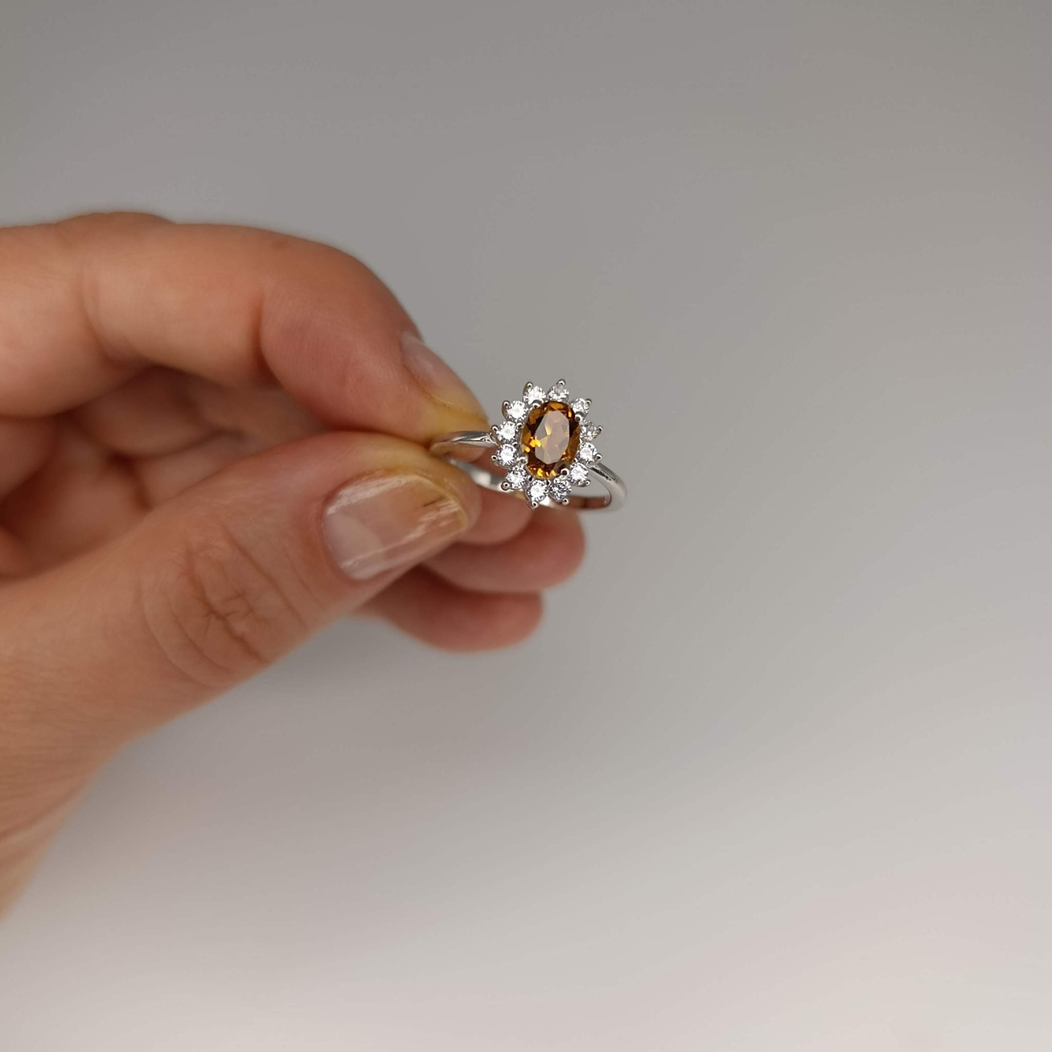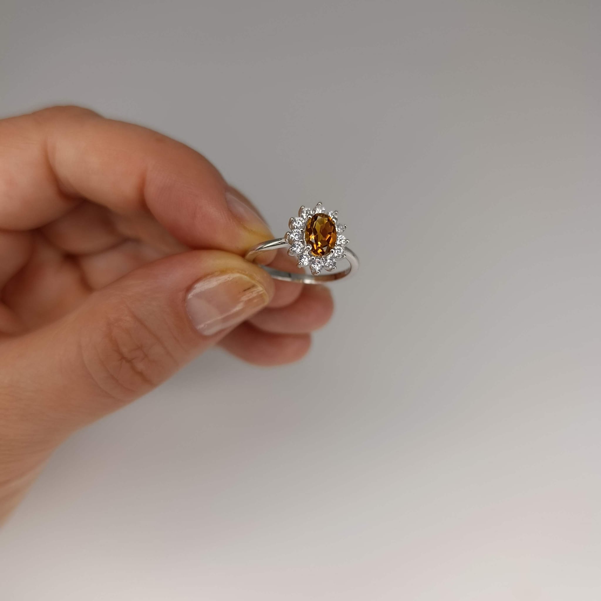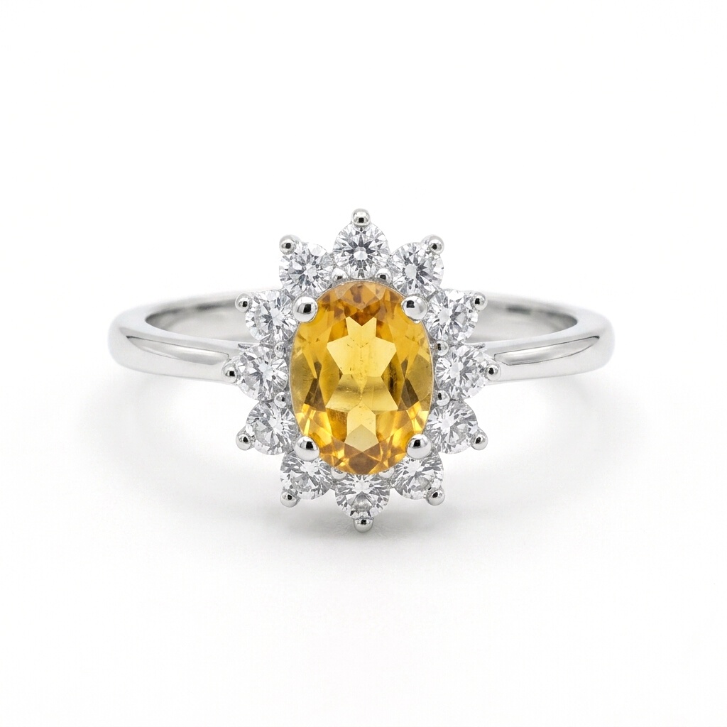 Pierścionek Słoneczny Amulet to manifestacja elegancji w ciepłych tonach. Centralny cytryn o owalnym szlifie został otulony krystalicznymi cyrkoniami, tworząc spójną i wyjątkowo piękną kompozycję. Całość wykonana z rodowanego srebra próby 925, z dbałością o najdrobniejszy szczegół. Certyfikat autentyczności potwierdza naturalne pochodzenie minerału. To biżuteria stworzona, by celebrować wyjątkowe chwile. Zadbaj o to, by wyróżnić się w tłumie – zamów już dziś.