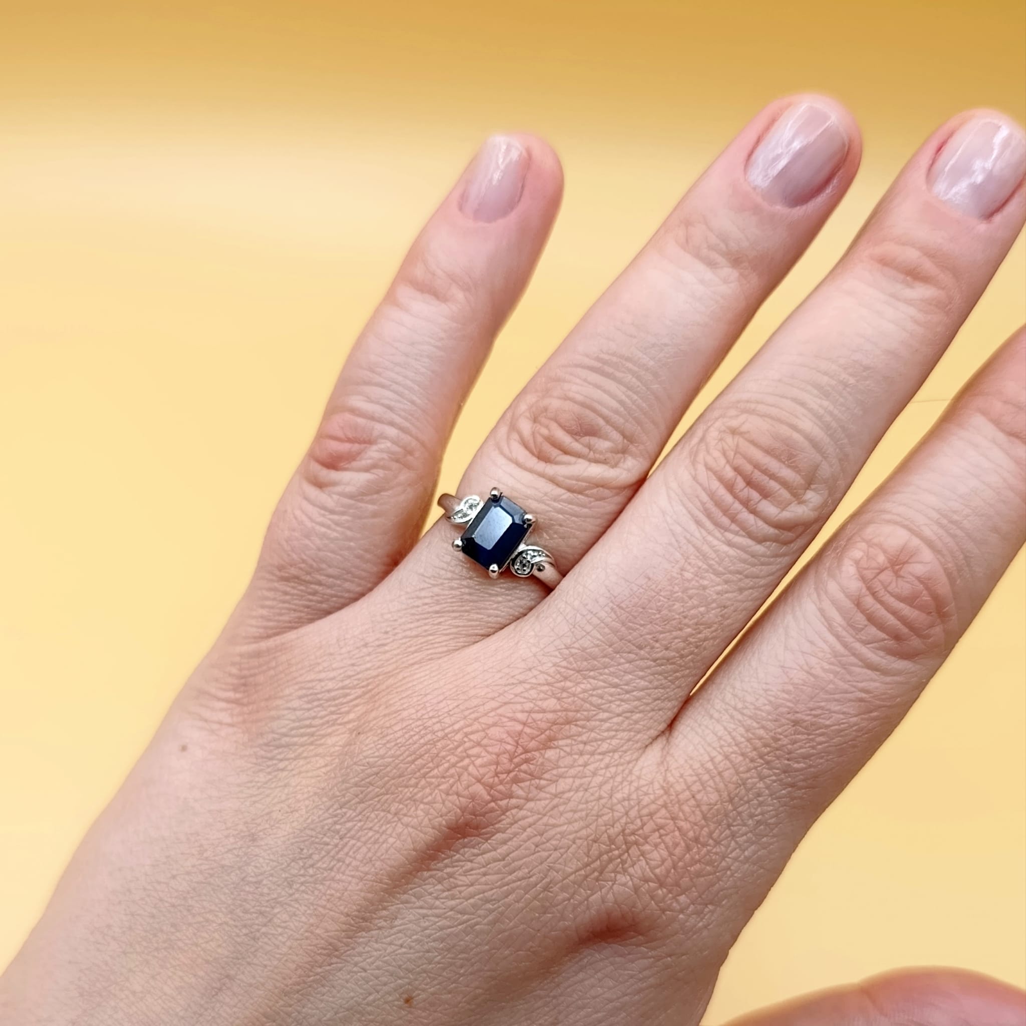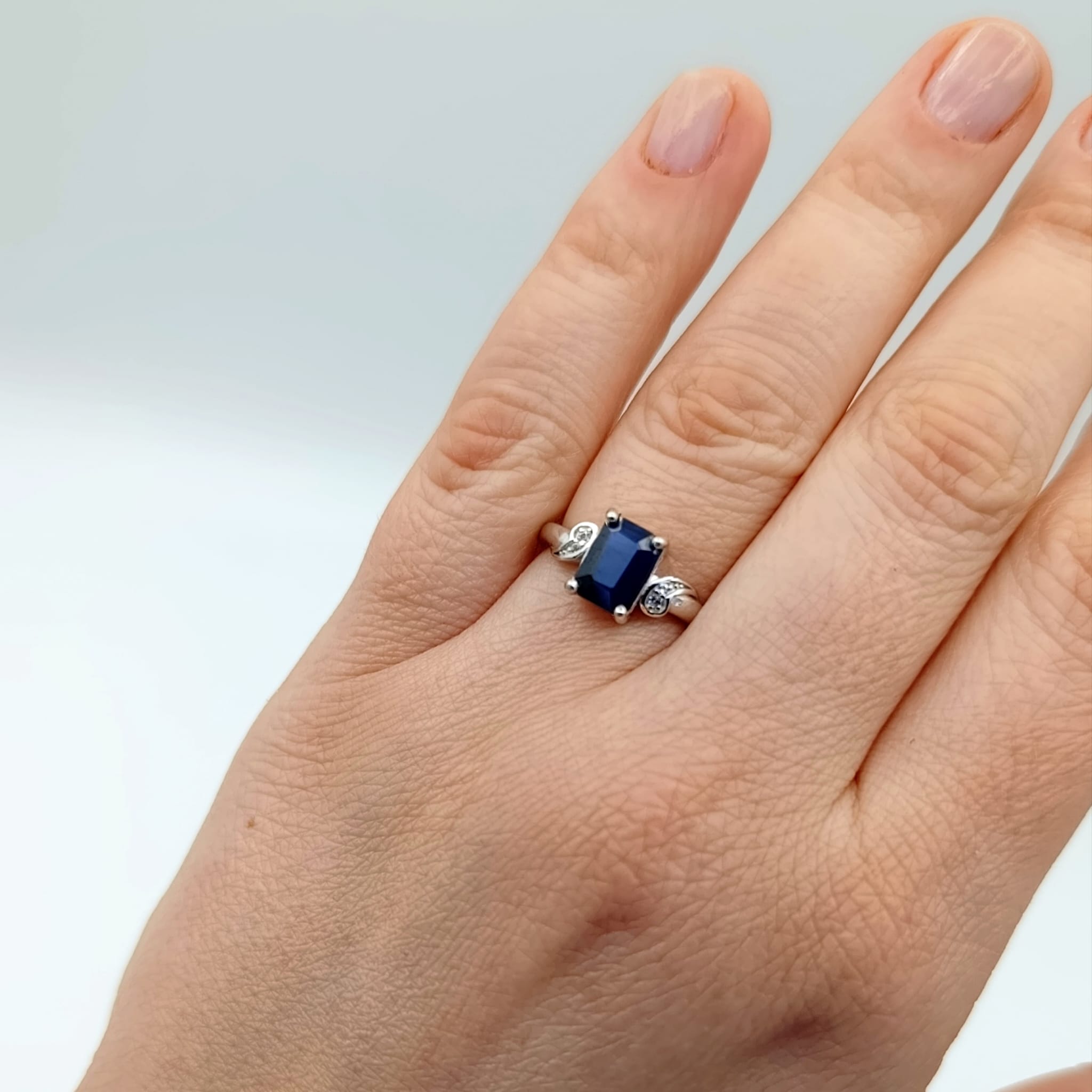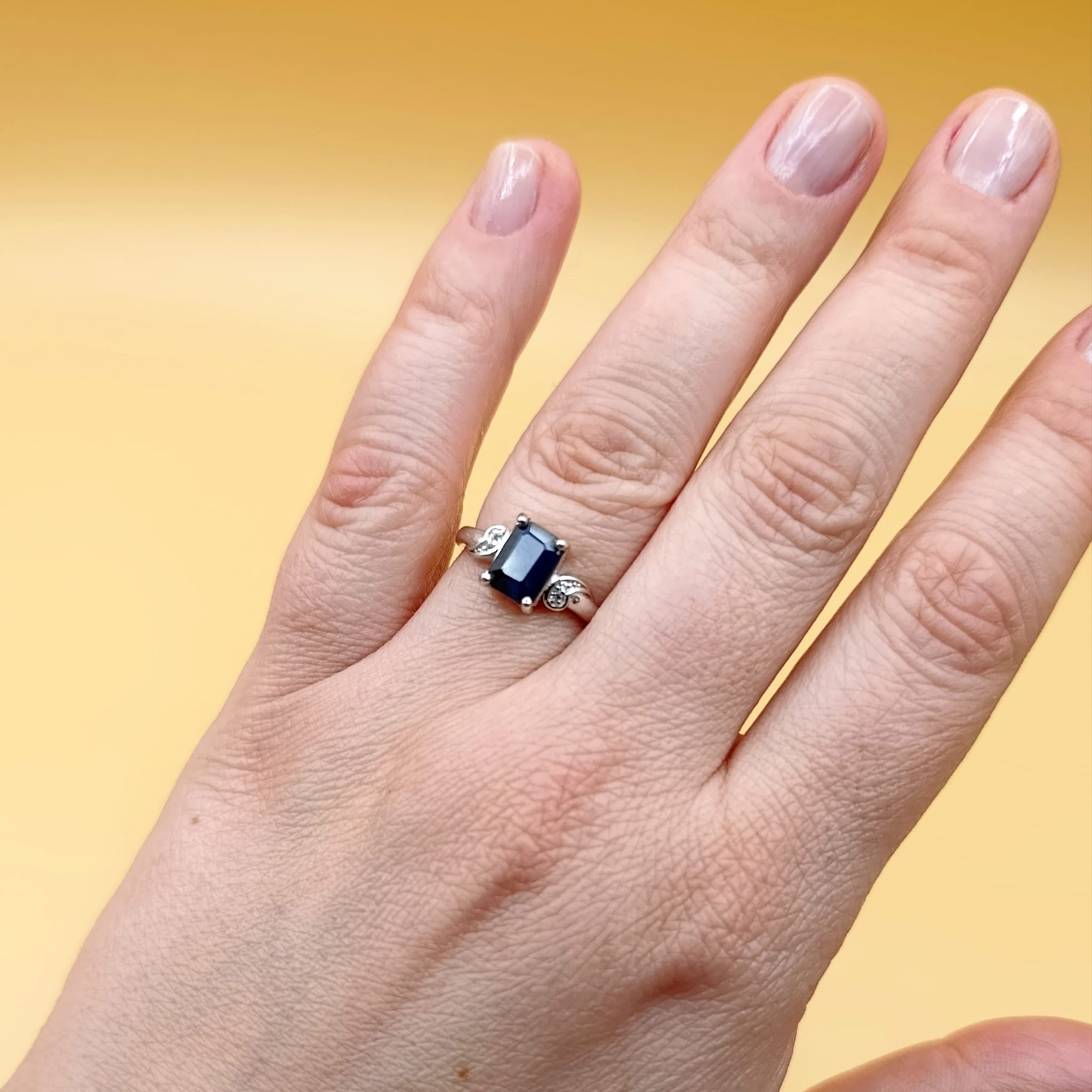 Szafir pochodzi z Tajlandii, cechuje go prostokątny kształt i precyzyjne fasetowanie. Masa kamienia: 2,9 ct. Waga pierścionka to średnio 2,70 g, w zależności od rozmiaru może wynosić 2,62–2,85 g.