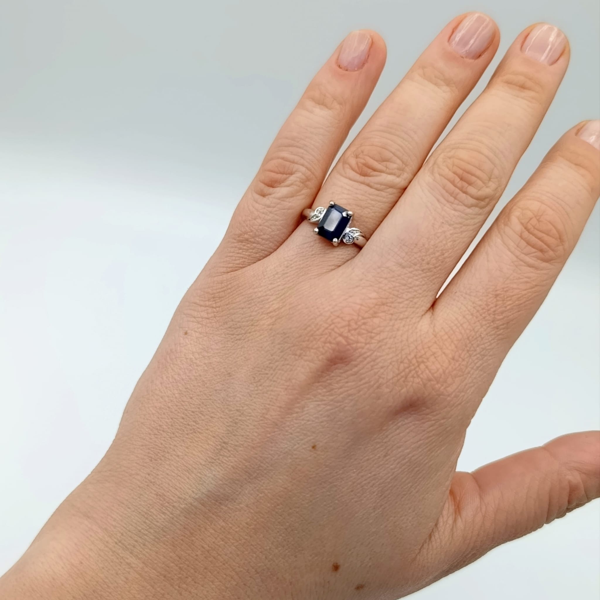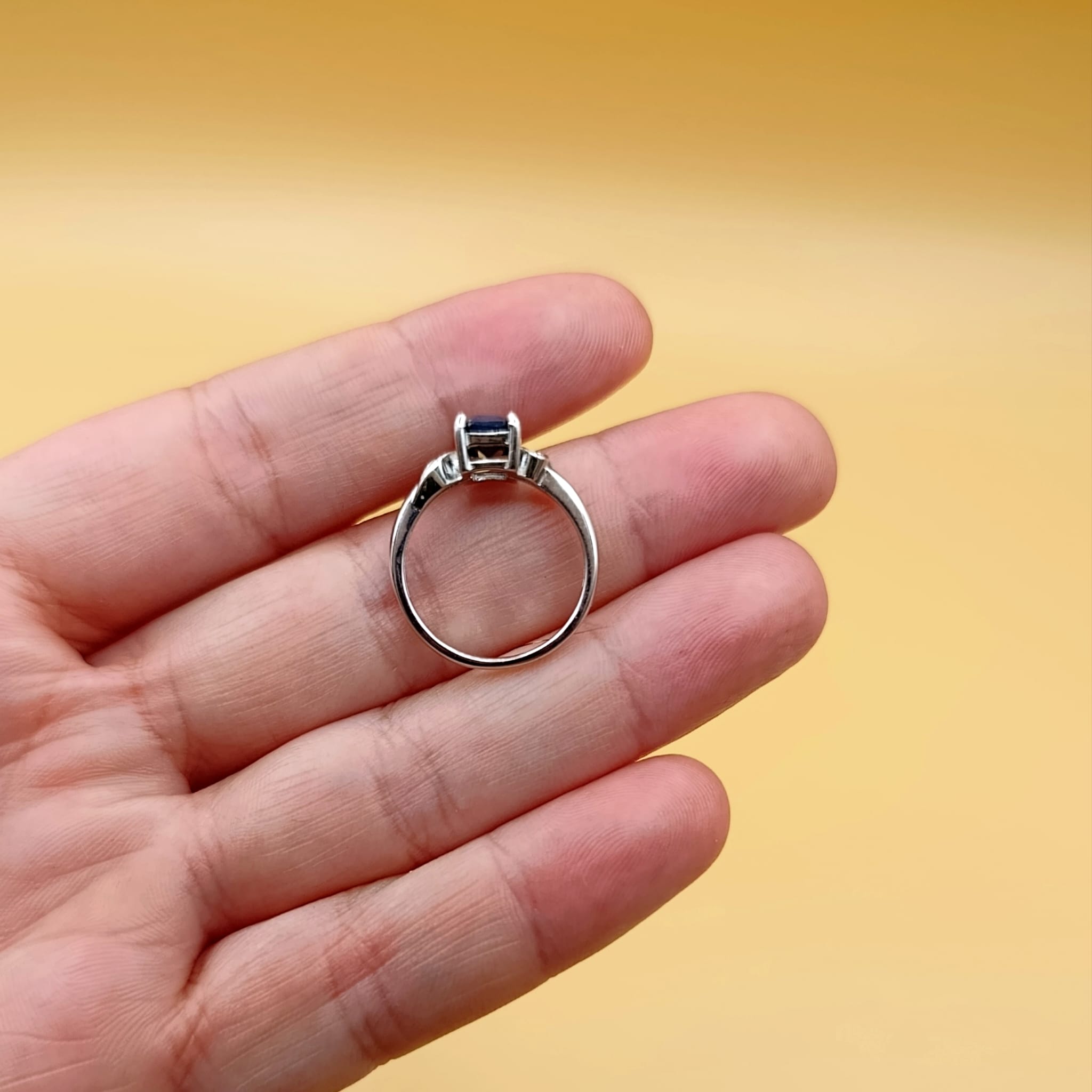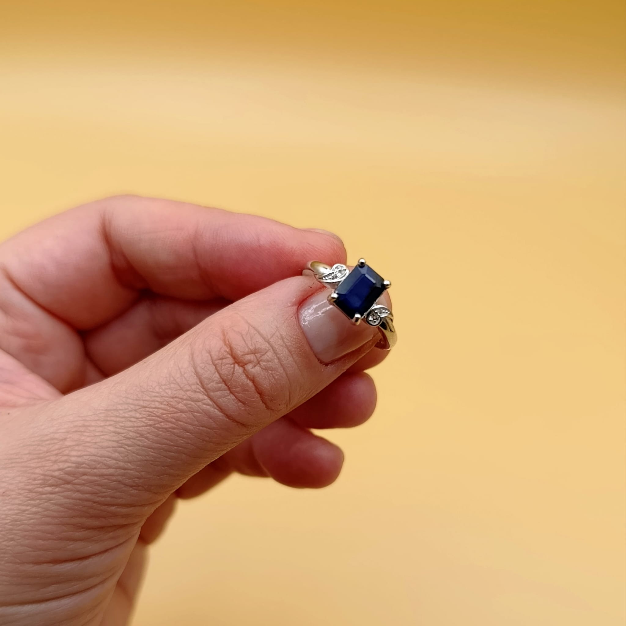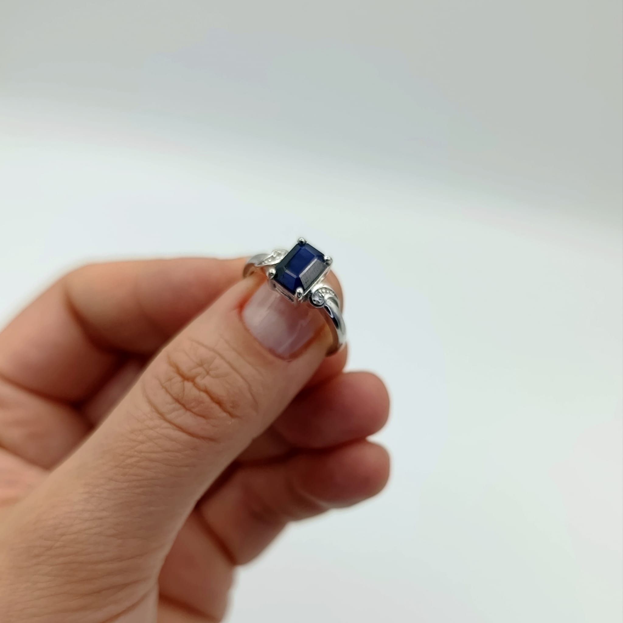 Szafir pochodzi z Tajlandii, cechuje go prostokątny kształt i precyzyjne fasetowanie. Masa kamienia: 2,9 ct. Waga pierścionka to średnio 2,70 g, w zależności od rozmiaru może wynosić 2,62–2,85 g.