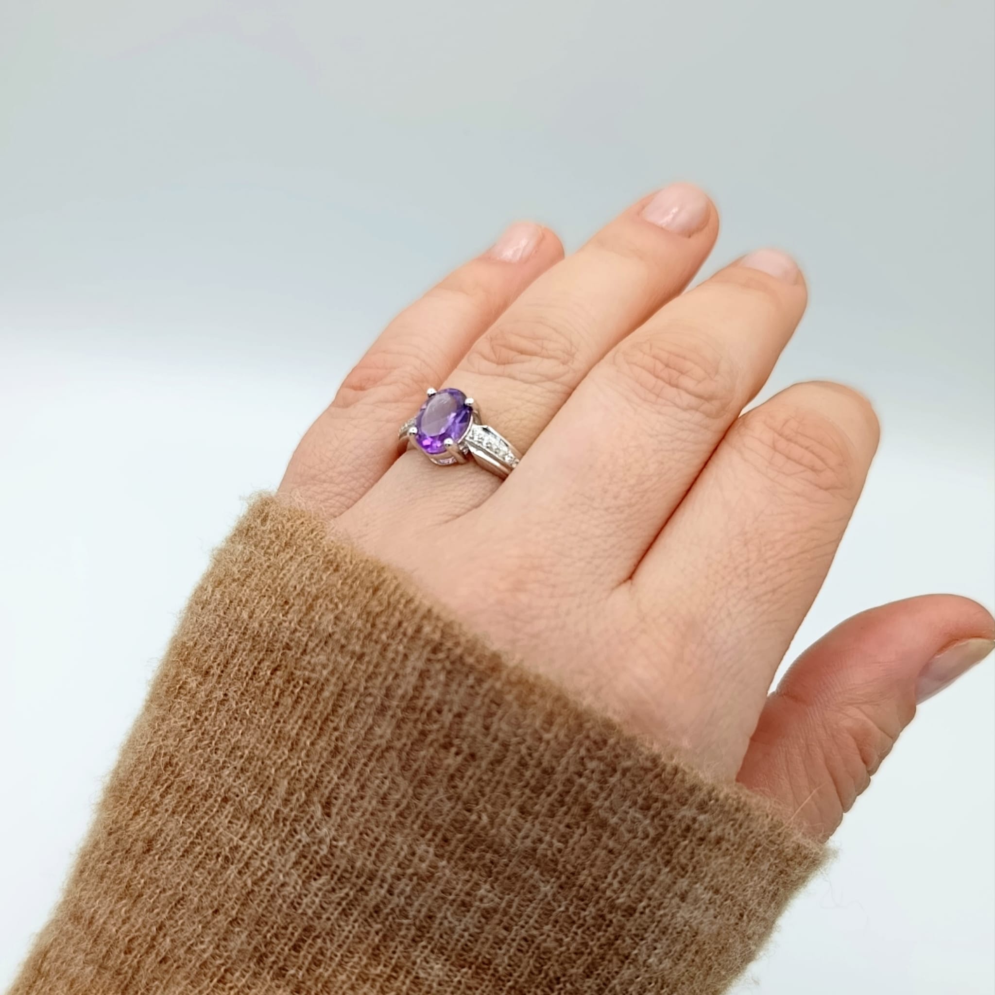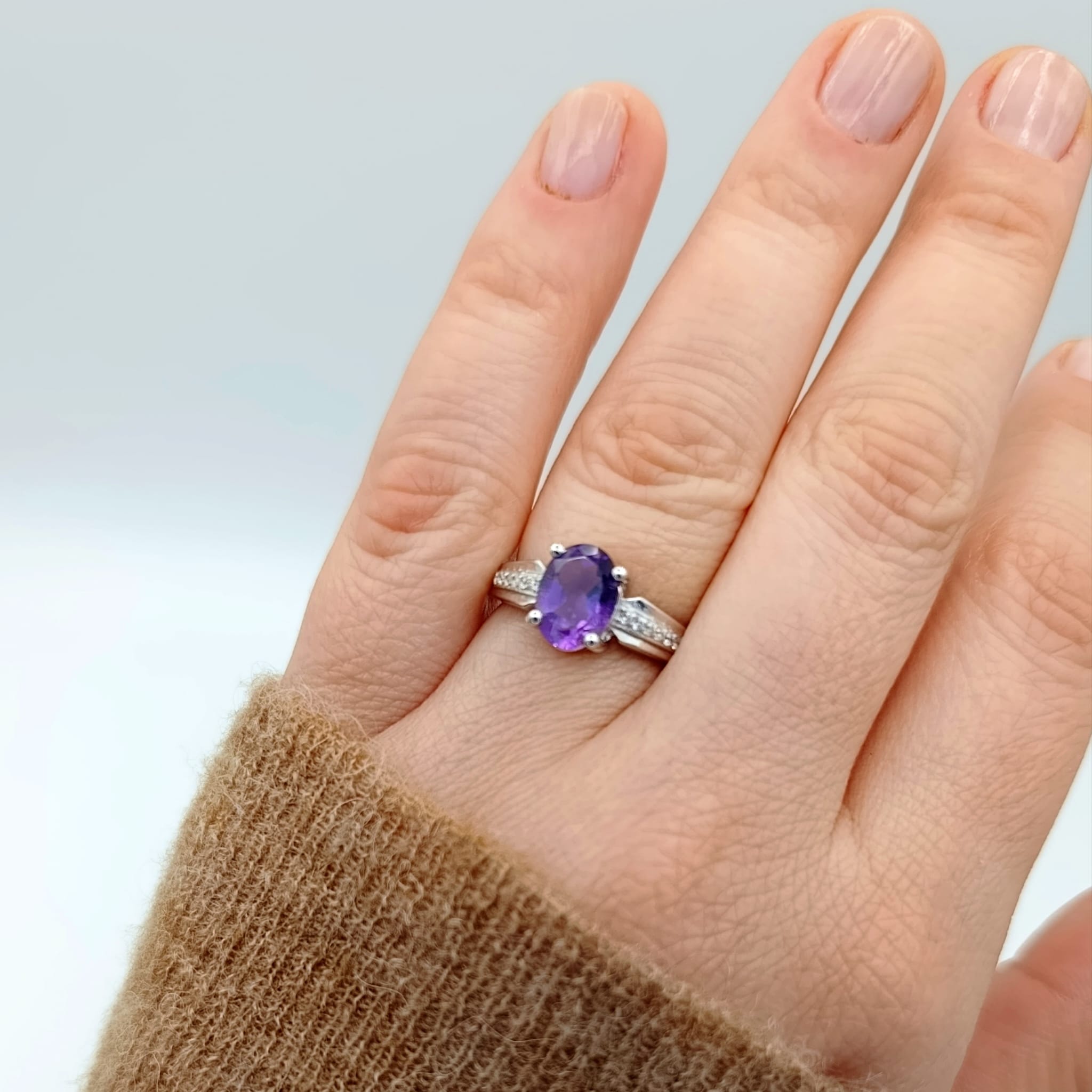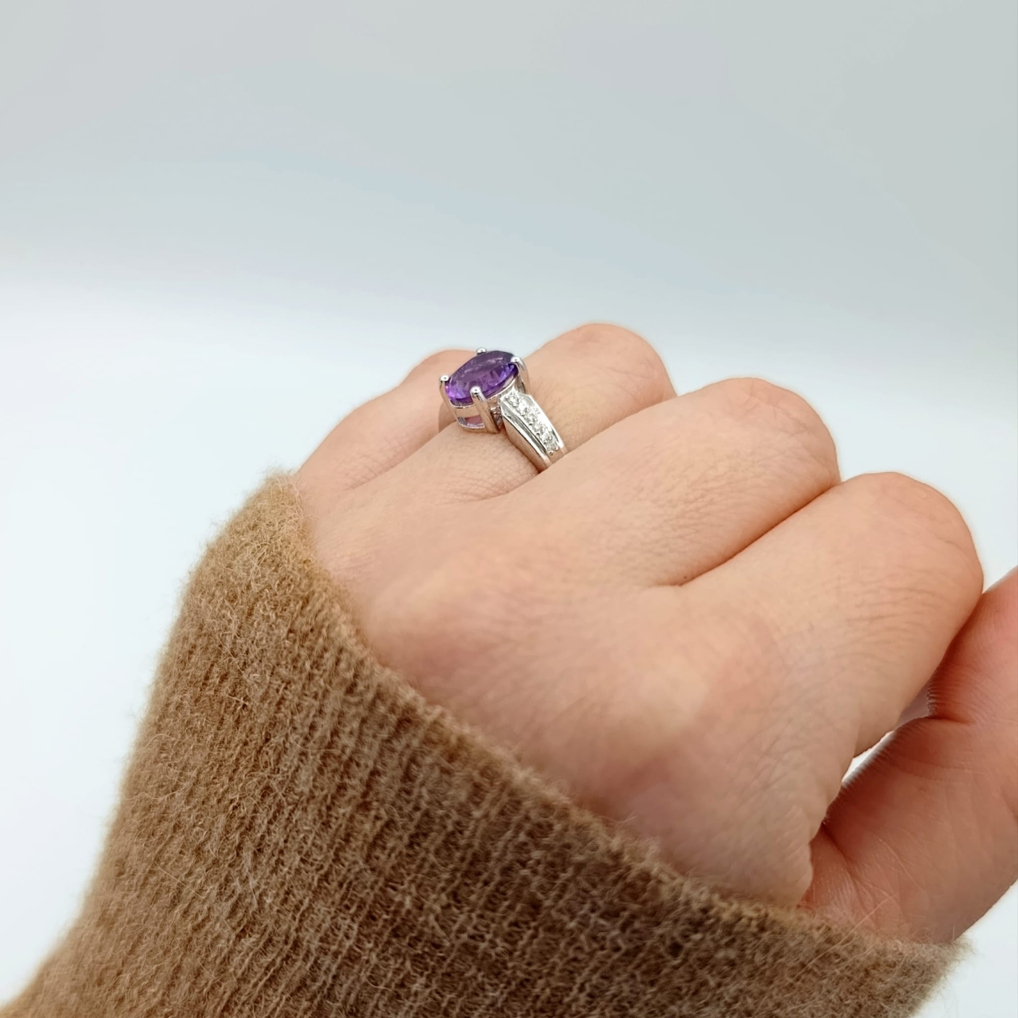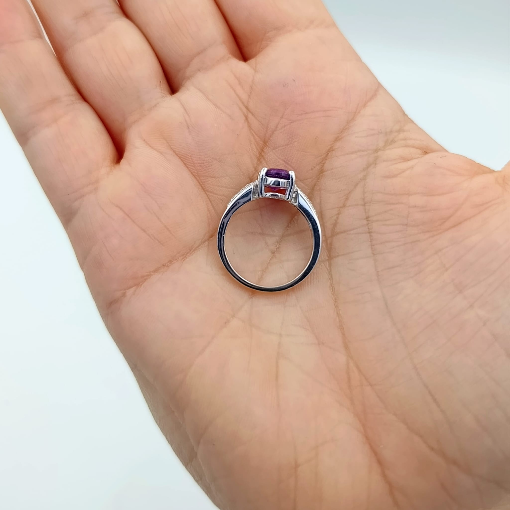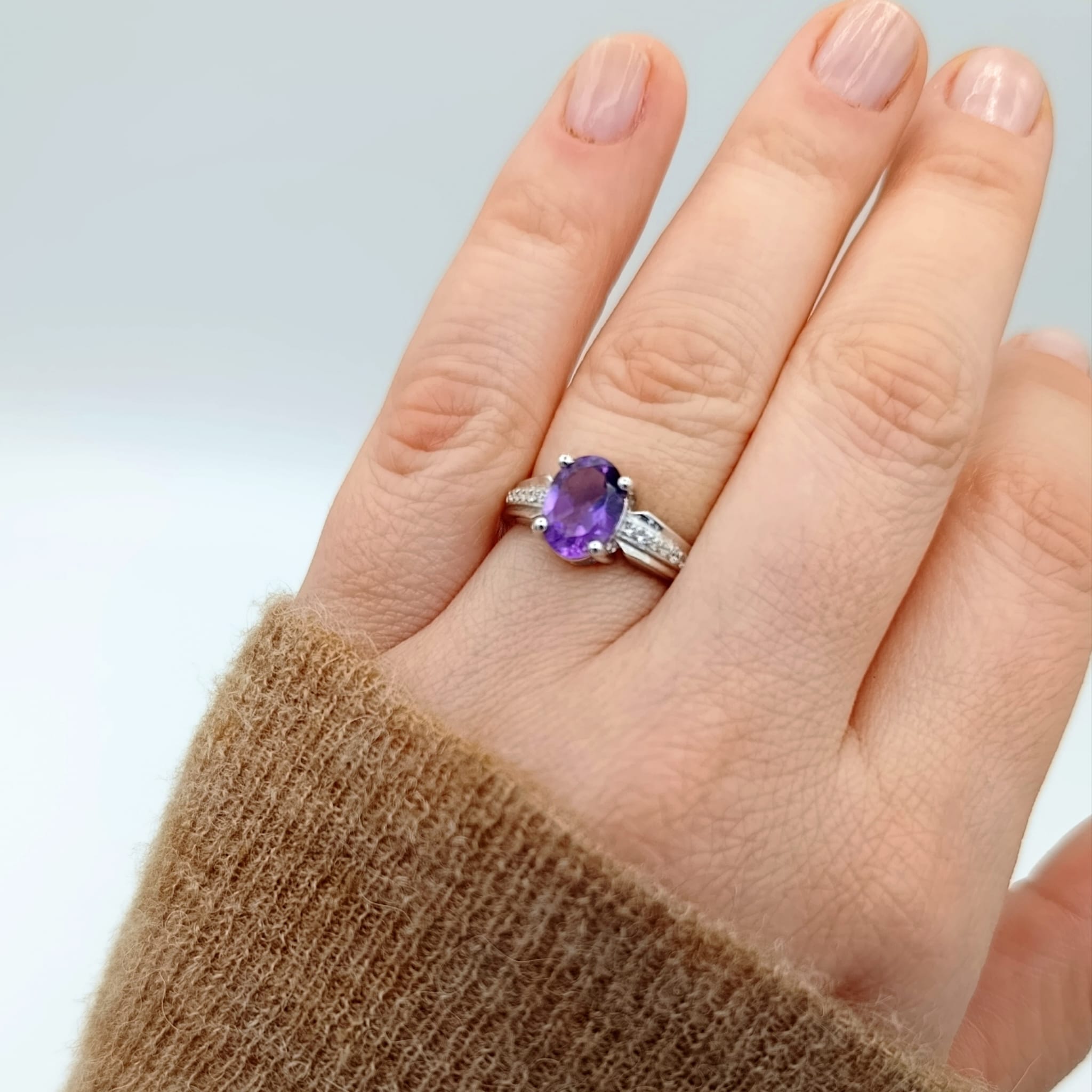 Uroczy pierścionek z naturalnym ametystem (9×7 mm) w głębokim fiołkowym odcieniu, otoczonym lśniącymi białymi cyrkoniami. Wykonany ze srebra próby 925 z rodowaną powłoką – zapewnia trwały, diamentowy połysk oraz odporność na korozję. Minimalistyczna, ponadczasowa forma podkreśla elegancję, dzięki czemu pierścionek będzie uniwersalnym dodatkiem zarówno do codziennych, jak i wieczorowych stylizacji. Ametyst symbolizuje mądrość i wewnętrzną harmonię, dodając noszącej go osobie spokoju i pewności siebie. To wyjątkowy prezent, który wyraża uczucia i podkreśla indywidualny styl obdarowanej.
