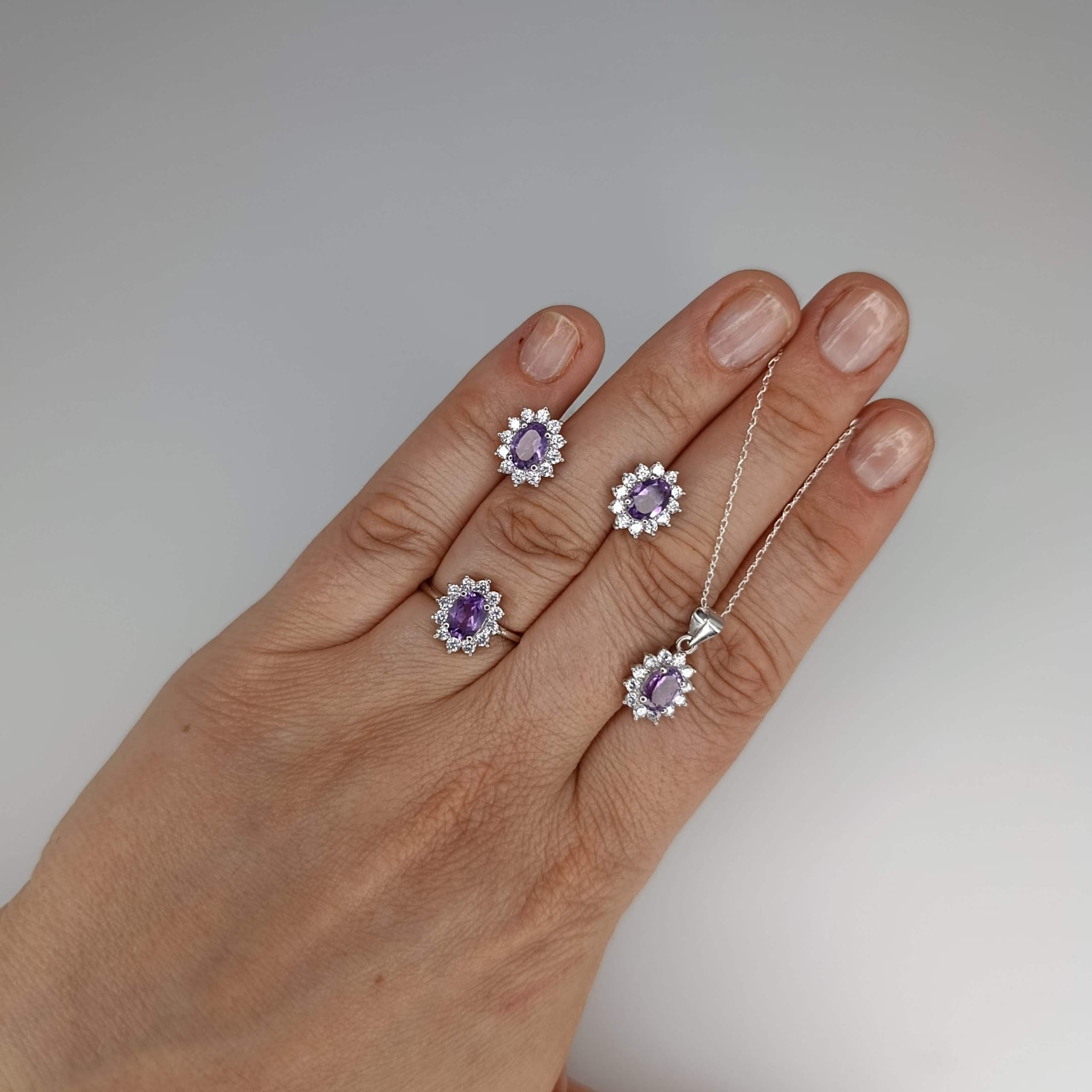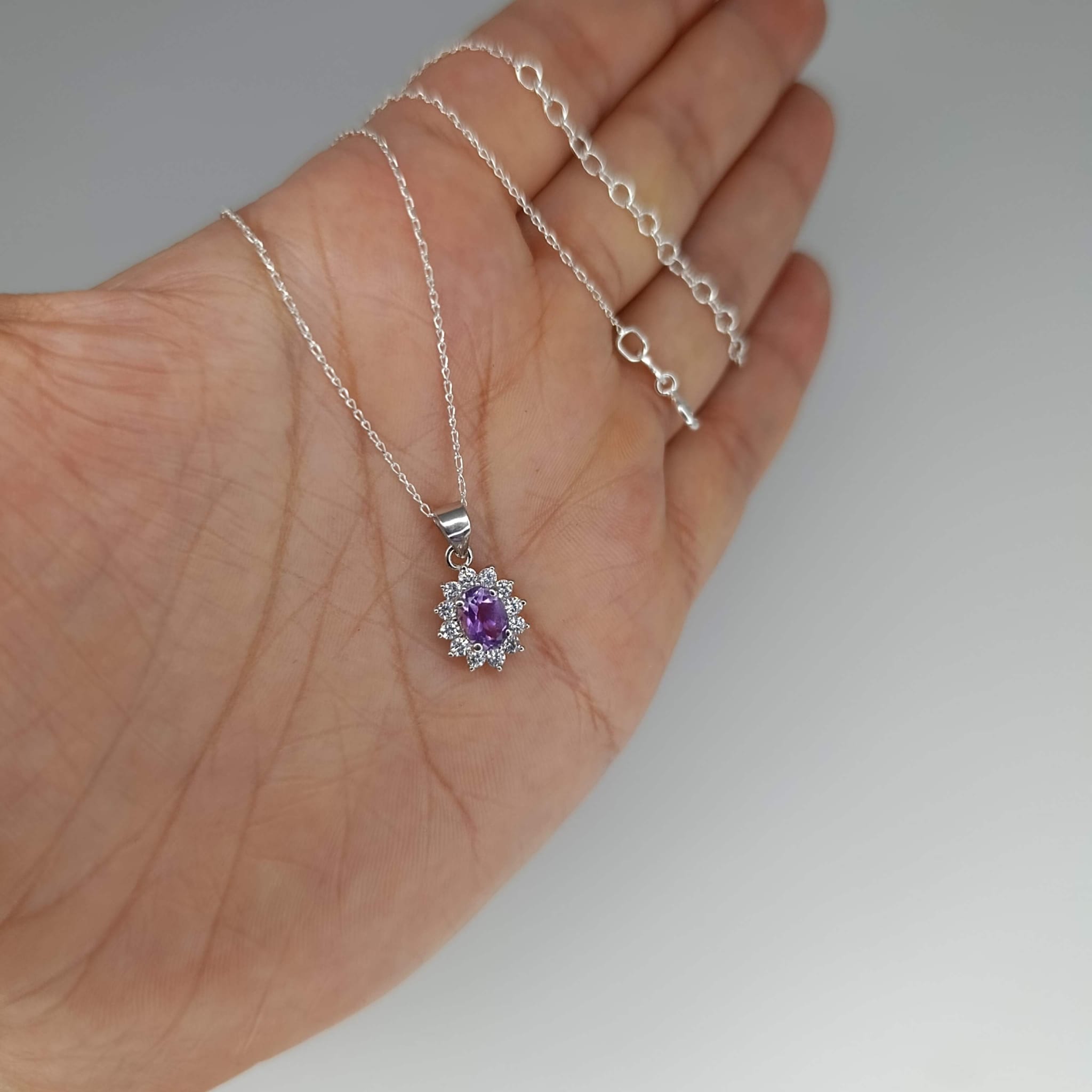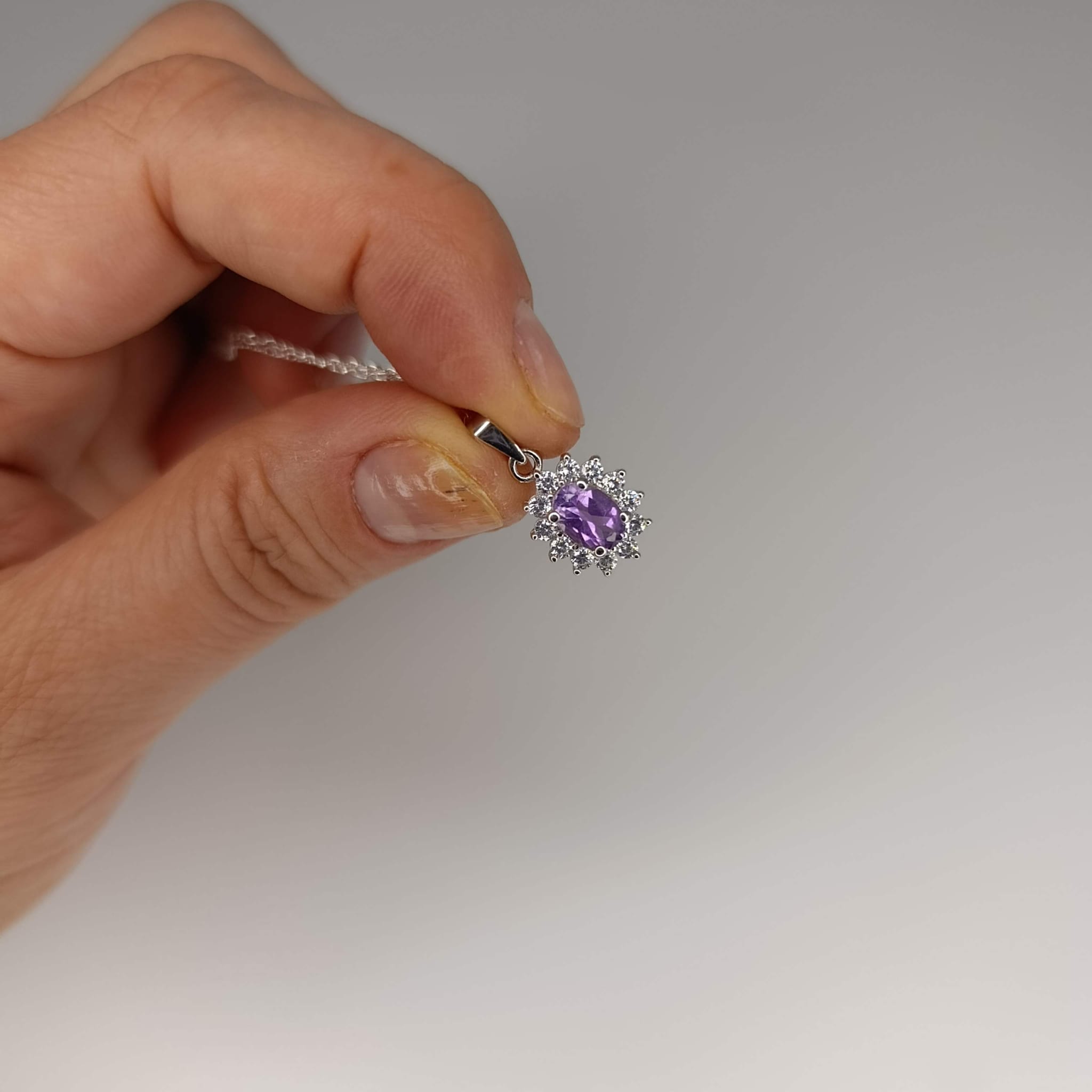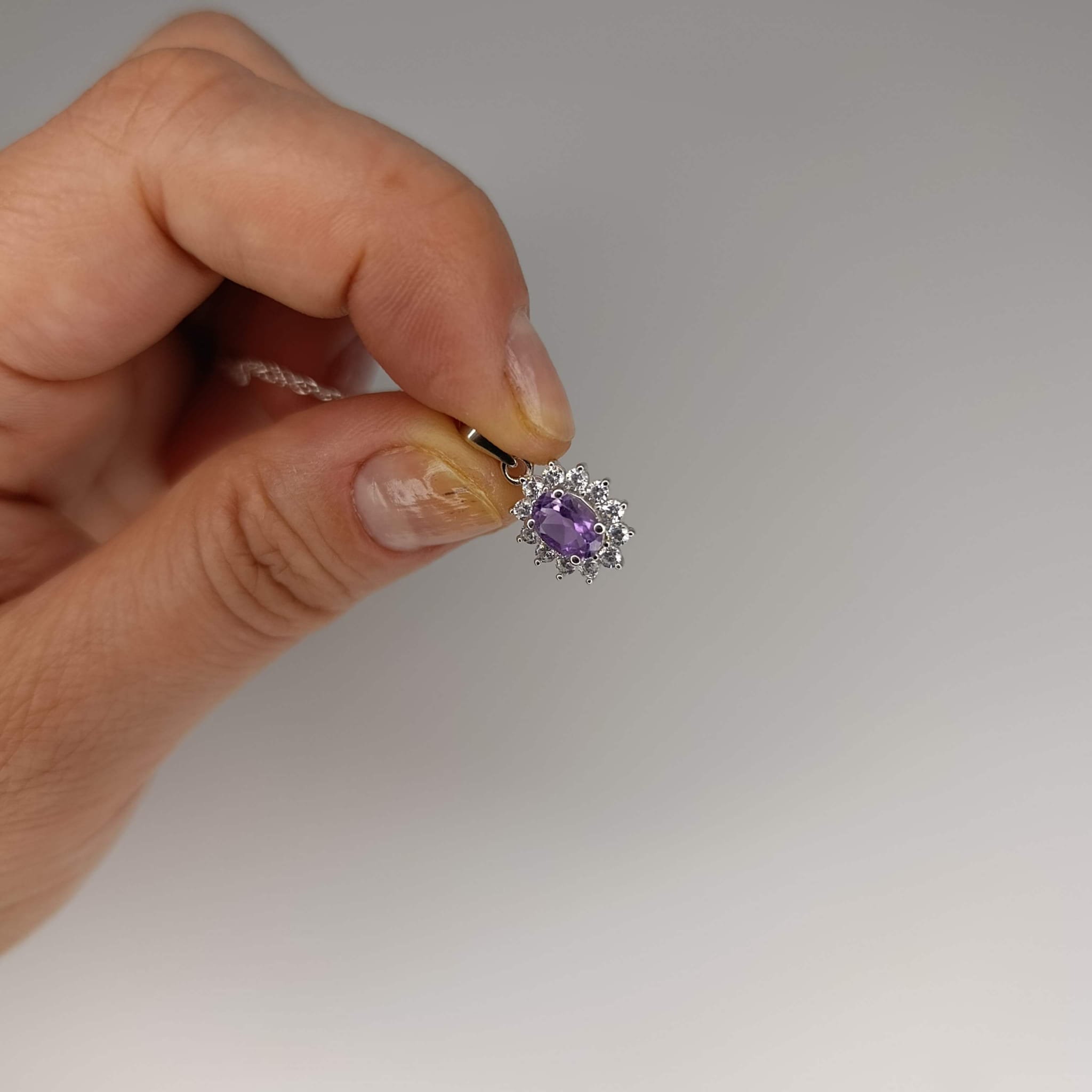 Naszyjnik „Ametystowa Poświata” to biżuteria, która potrafi odmienić charakter całej stylizacji. Owalny ametyst 7×5 mm otoczony drobnymi akcentami świetlnymi tworzy efekt subtelnego rozświetlenia na skórze — jakby kamień miał własną aurę.