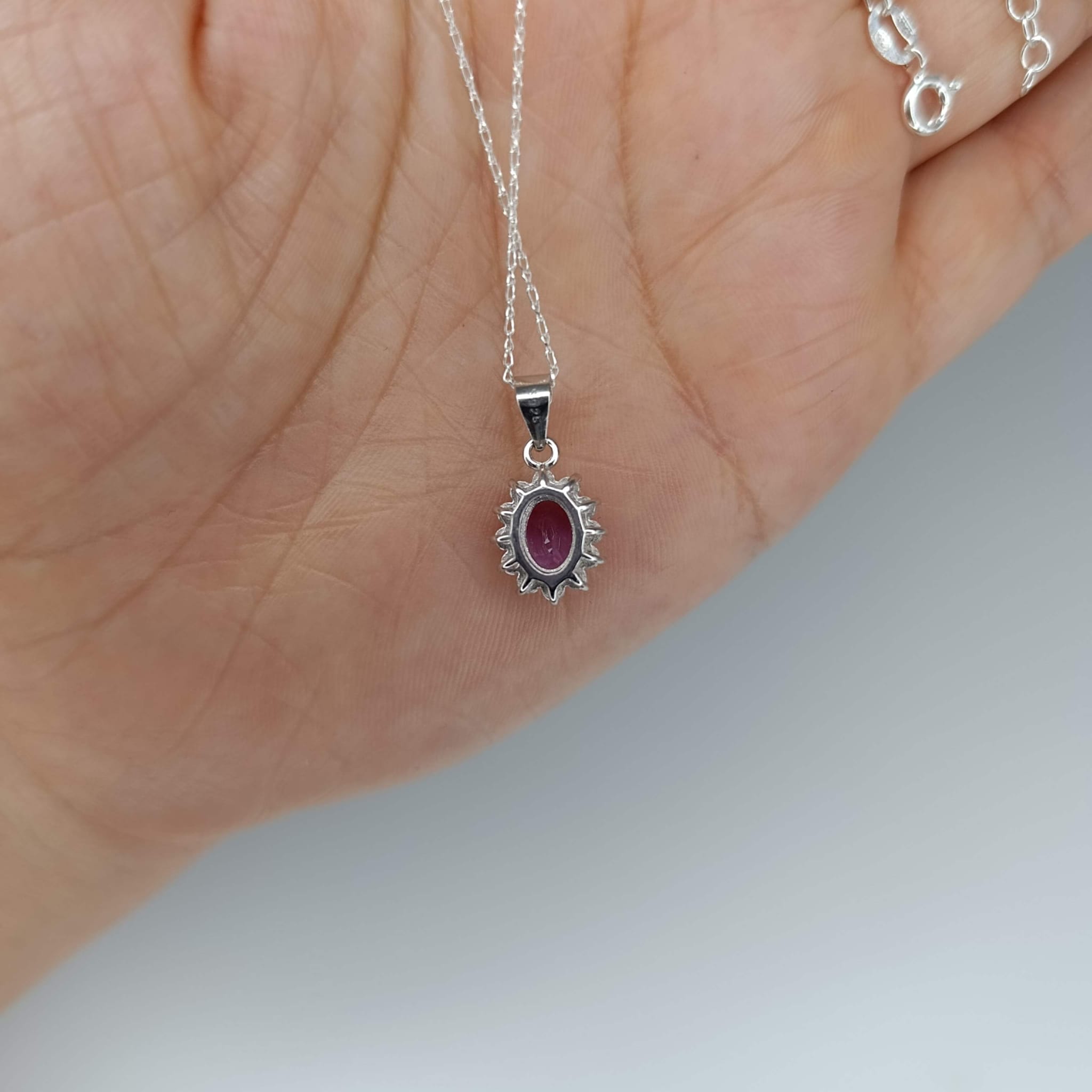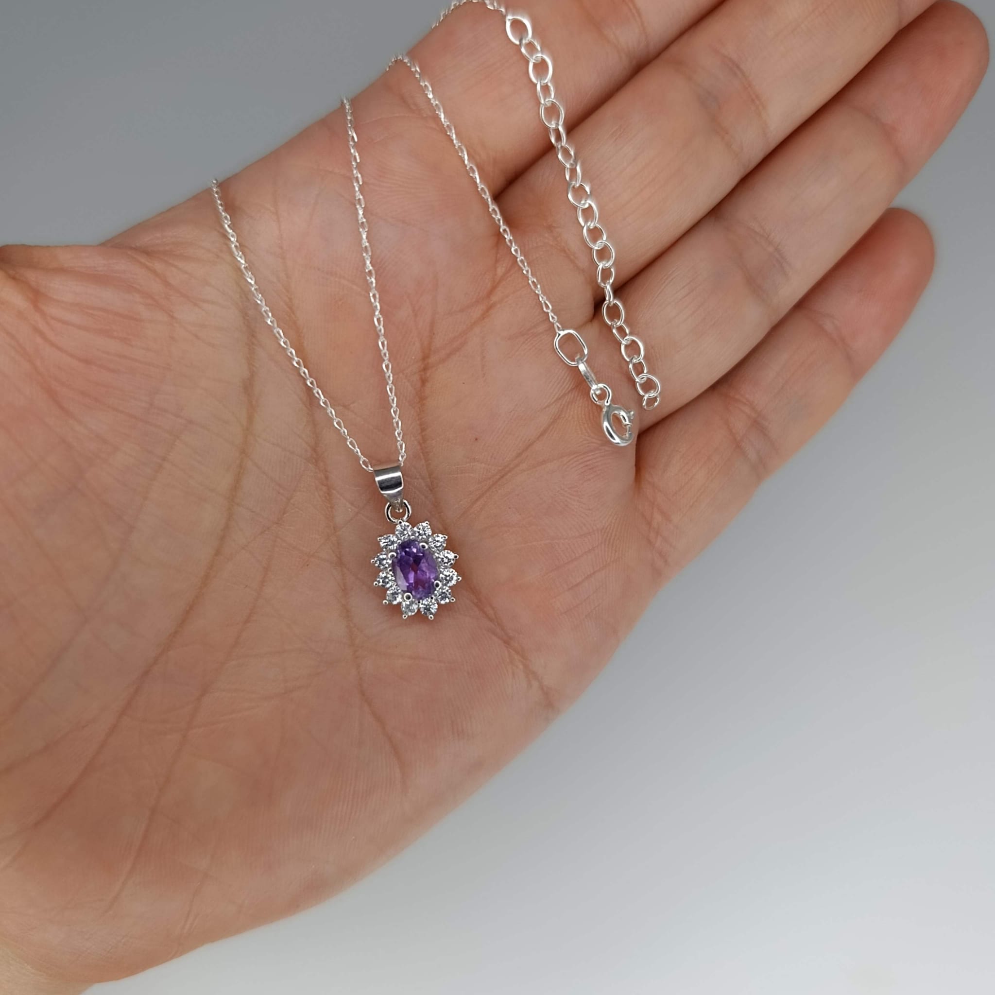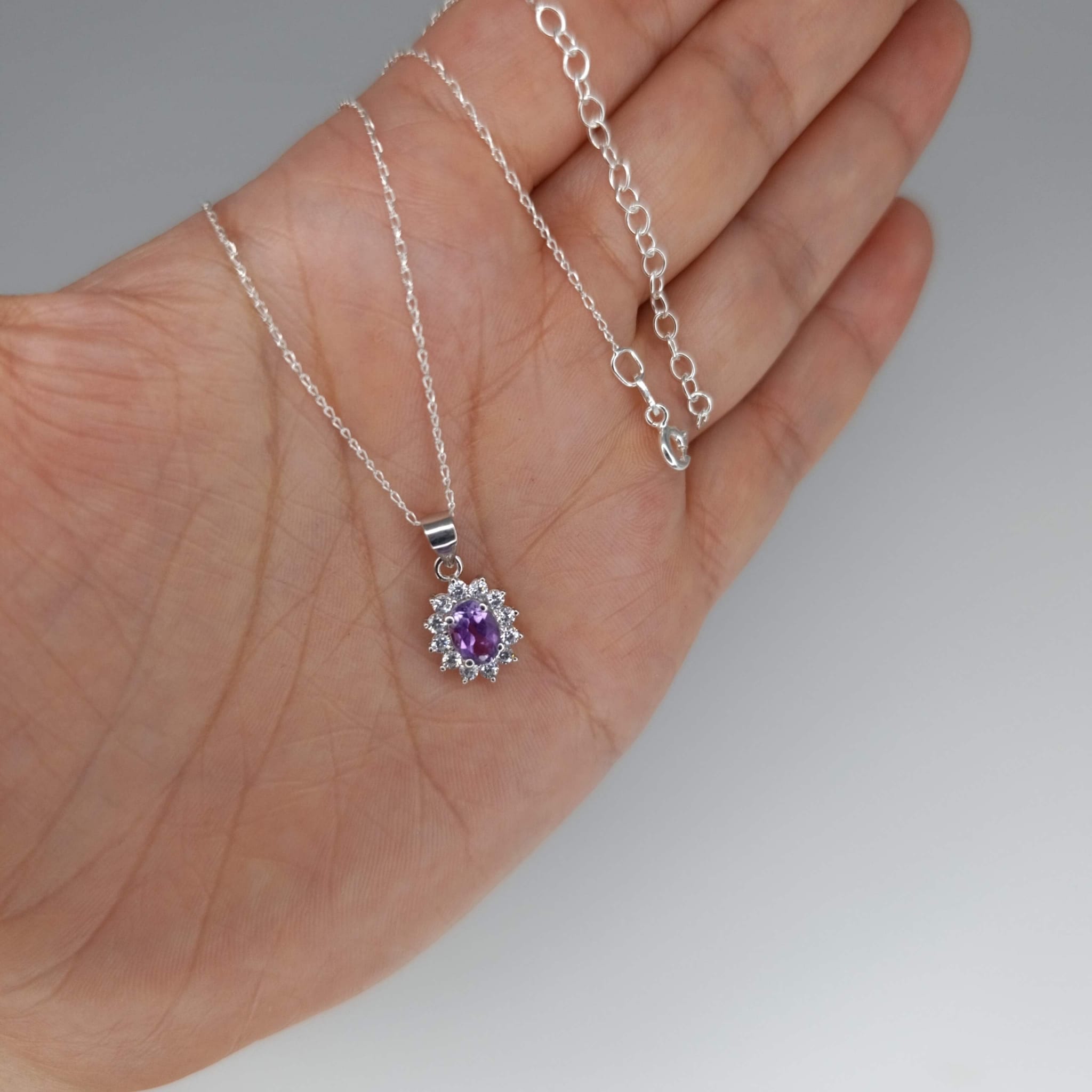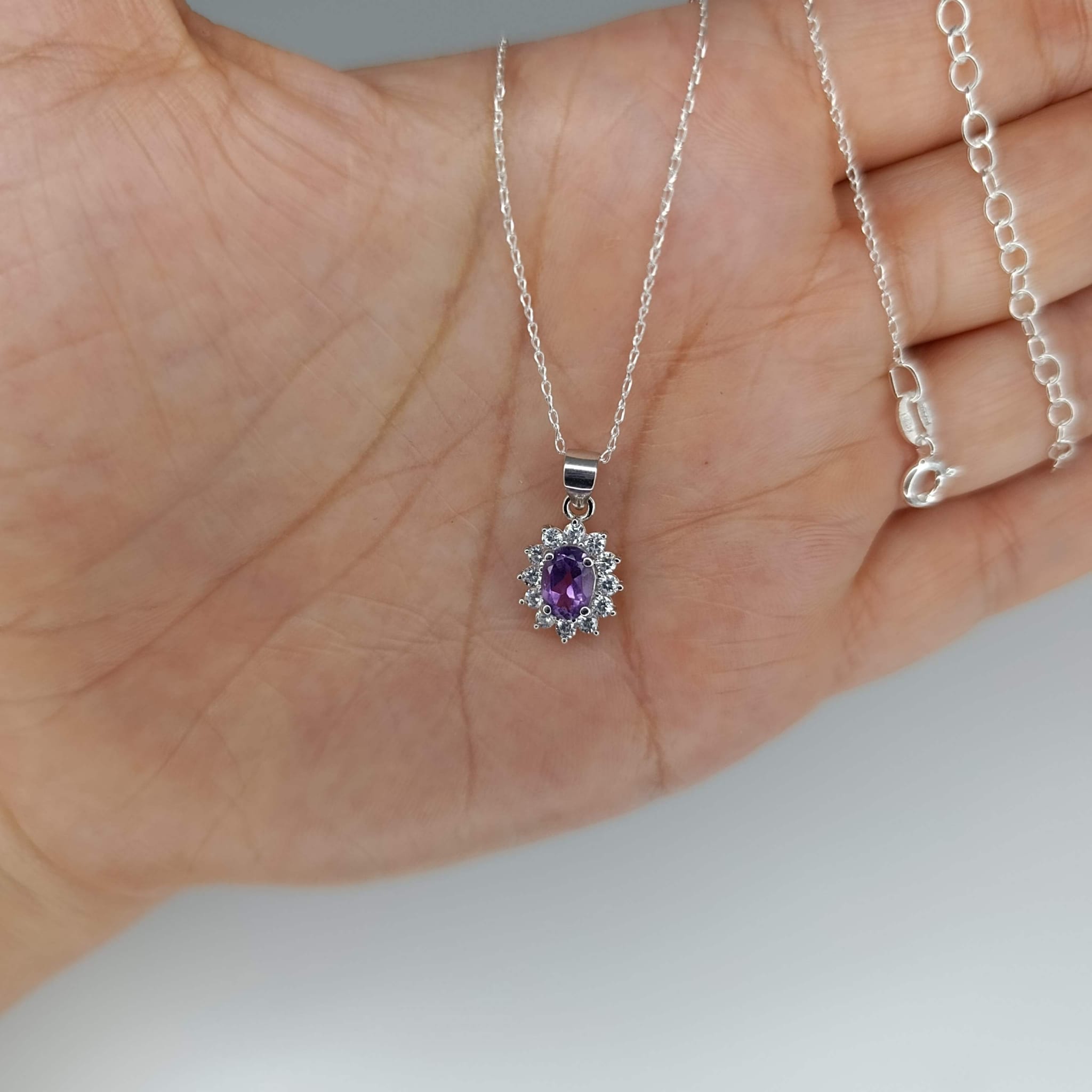 Naszyjnik „Ametystowa Poświata” to biżuteria, która potrafi odmienić charakter całej stylizacji. Owalny ametyst 7×5 mm otoczony drobnymi akcentami świetlnymi tworzy efekt subtelnego rozświetlenia na skórze — jakby kamień miał własną aurę.