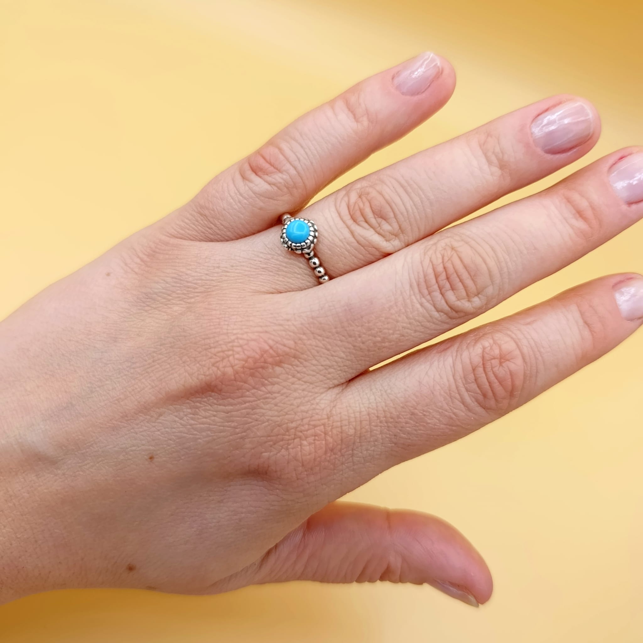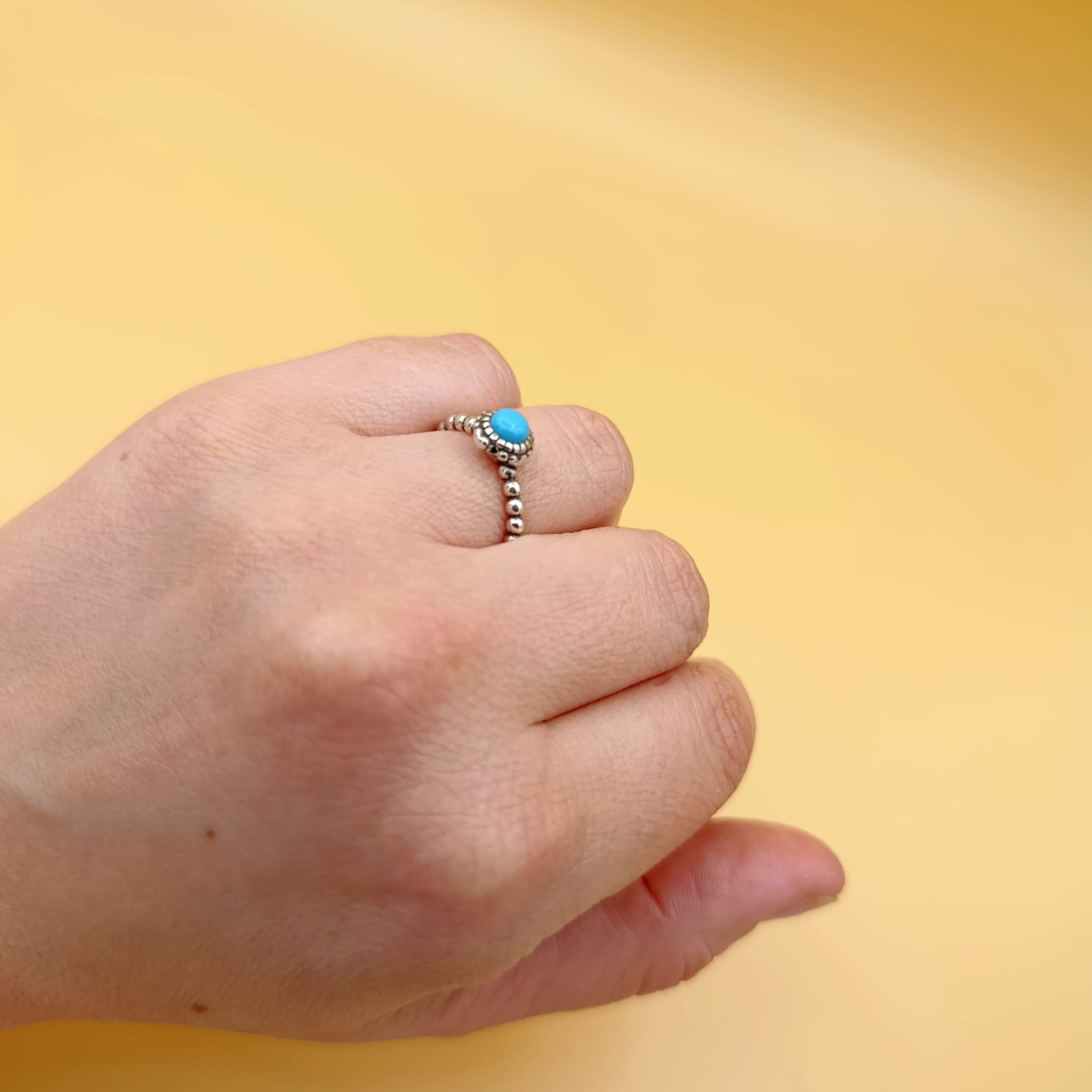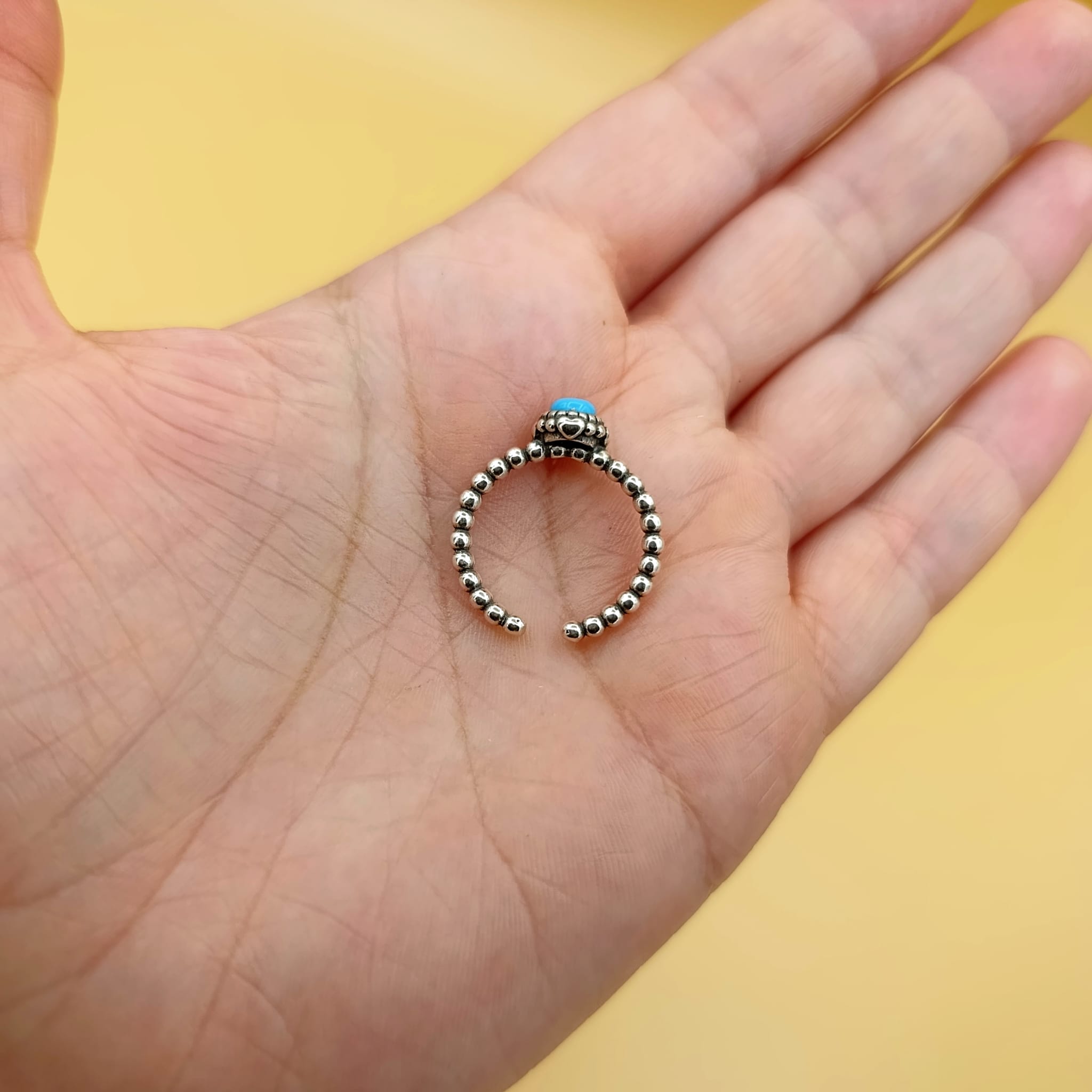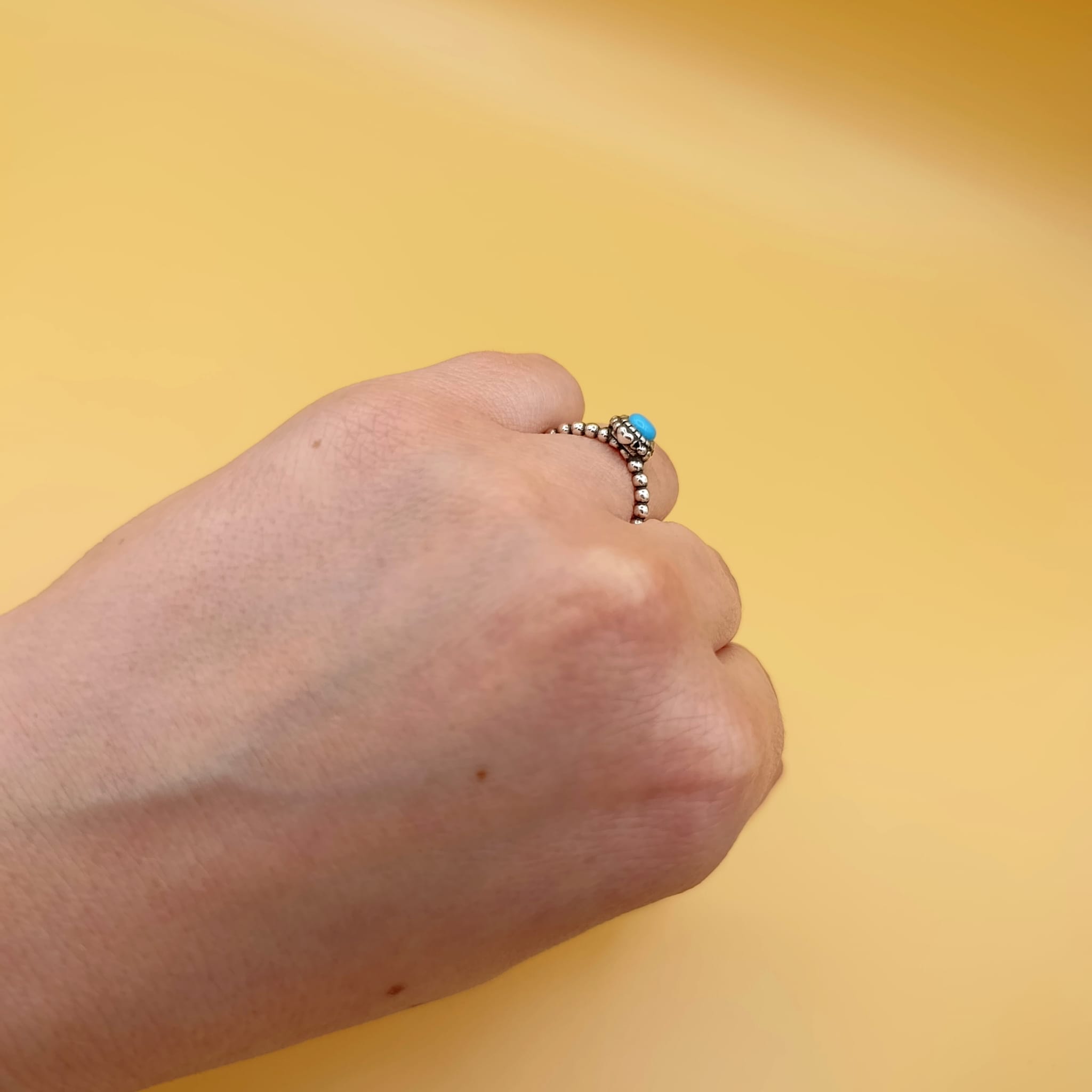 Ten regulowany pierścionek to idealny wybór dla osób, które kochają biżuterię o artystycznym boho charakterze. Centralnym punktem jest syntetyczny turkus o intensywnym, niepowtarzalnym kolorze, osadzony w dekoracyjnej oprawie ze srebra 925. Drobne, oksydowane elementy podkreślają strukturę i dodają całości głębi, tworząc efektowny kontrast między jasnym kamieniem a ciemniejszymi akcentami.